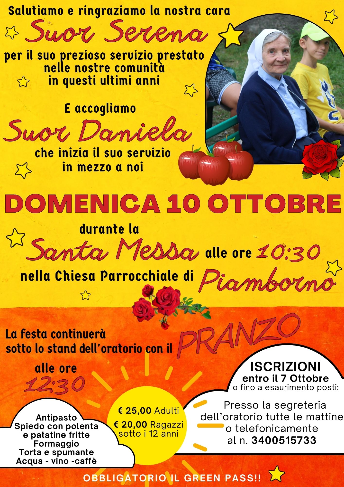 Domenica 10 Ottobre 2021 alle ore 10:30 nella S. Messa in chiesa a Piamborno saluteremo Suor Serena che diventa Madre superiora a Milano e daremo il benvenuto a suor Daniela che inizia il suo servizio nelle nostre parrocchie.