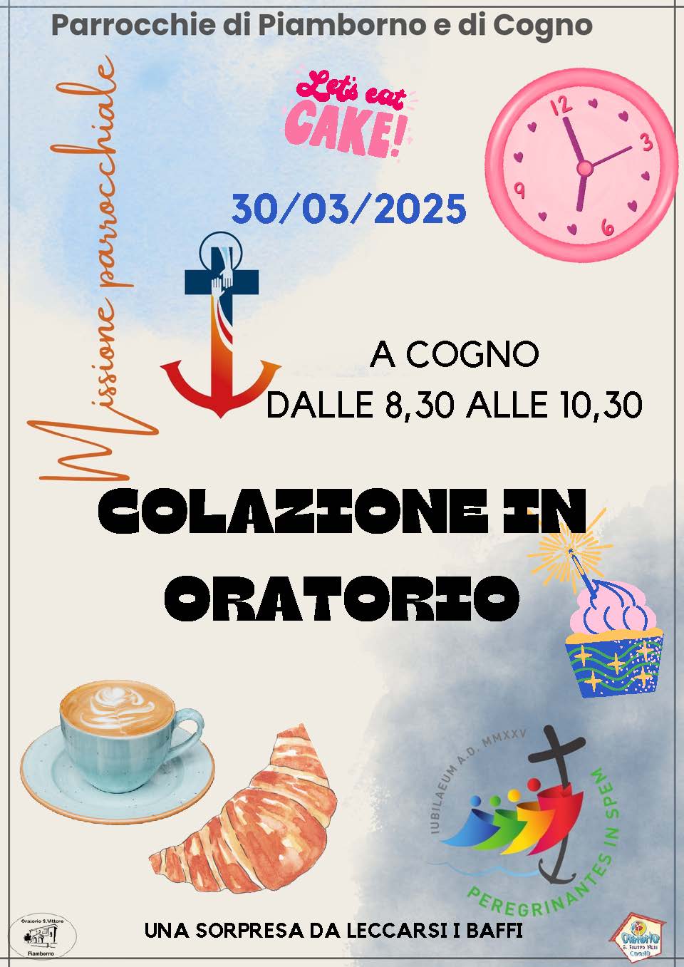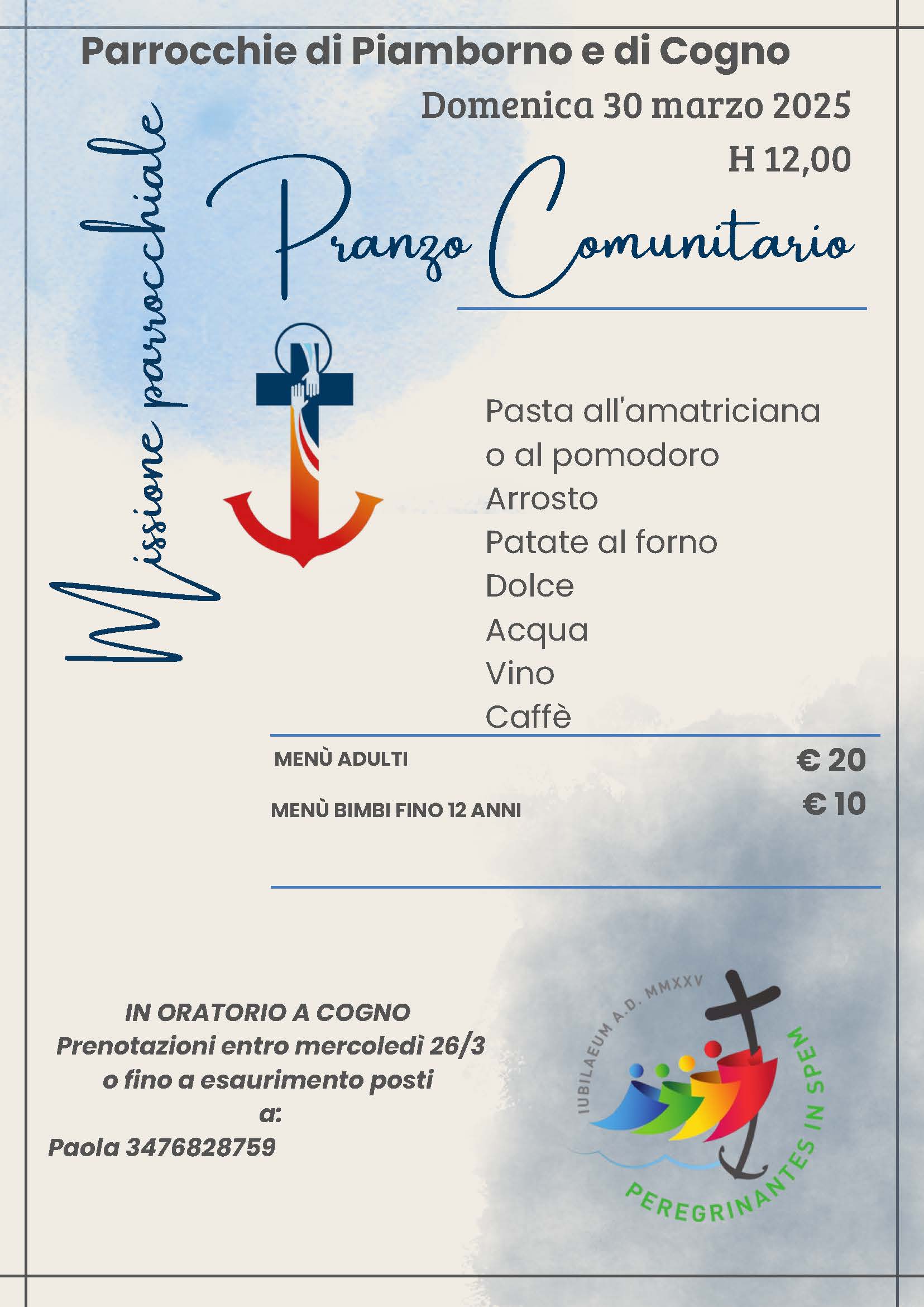 • 12:30 Pranzo comunitario su prenotazione entro mercoledì 26 marzo al n° 3476828759 – Paola (Oratorio Cogno)
