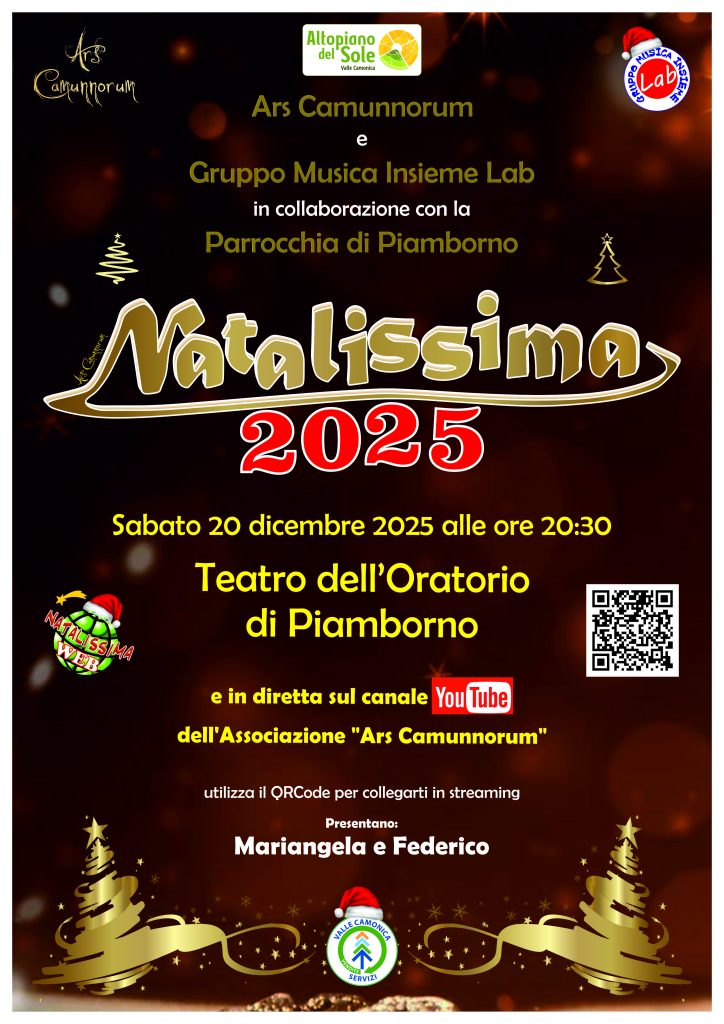 Come da tradizione, il Gmi Lab e Ars Camunnorum organizzano per sabato sera 20 dicembre nel teatro parrocchiale di Piamborno, Natalissima, l’occasione per scambiarci gli auguri in musica ….e non solo musica!